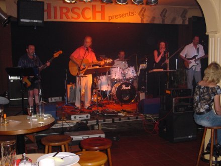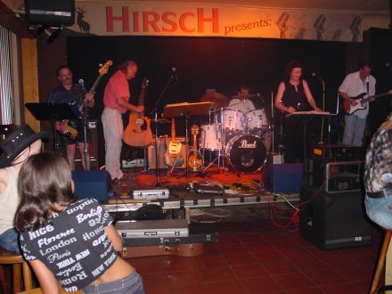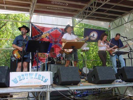 Der CWC Stammheim veranstaltete wieder ein großes Benefiz-Country-Open-Air-Wochenende mit vielen Bands zugunsten eines kranken Kindes. Diesmal war auch WESTWÄRTS dabei. Wir spielten am Samstag, nützten aber die Gelegenheit zu einem kleinen "Betriebsausflug": Die meisten von uns kamen schon am Freitag nach Stammheim, um auch mal wieder die Kollegen zu hören. (Ist für Musiker ja immer interessant, zu sehen und zu hören, was andere so machen!) Die Leute vom CWC hatten ihr Gelände toll hergerichtet und trotz der immer noch bulligen Sommertemperaturen war es am Freitag Abend brechend voll! Die Qualität der Musik enttäuschte uns zum Teil. Was soll man als Musiker von einem Kasper halten, der "ganz in weiß" und mit professionell aussehendem Head-Set auf "Garth-Brooks-Look" macht, sich die ganze Zeit eine Gitarre um den Hals hängt und gar nicht darauf spielen kann ... Es flossen an diesem Abend in erheblichem Maß auch viele andere Stilrichtungen ein. (z.B. Beatles-Titel, "Smoke on the water", Reggae, Pop-und-Rock-Oldies etc.) Ob das auf ein Coutnry-Fest gehört, darüber kann man bekanntlich diskutieren... Aber sonst: Ein ganz tolles Ambiente mit dem Trapperlager, den vielen Stores&Bars, die zum Verweilen und Kaufen einluden, dem Hufeisenwerfen hinter der Bühne undsoweiter undsoweiter ... Und natürlich die vielen, vielen netten Leute auf diesem Fest! Wir blieben auch sehr lange!