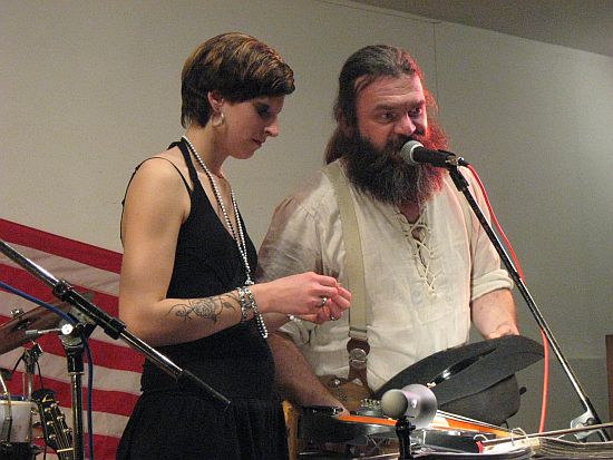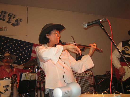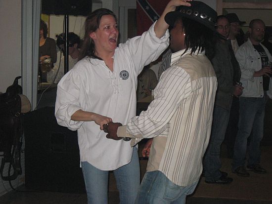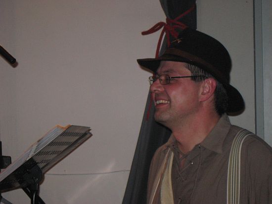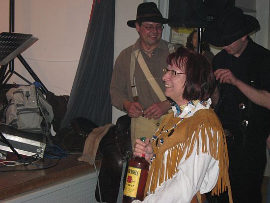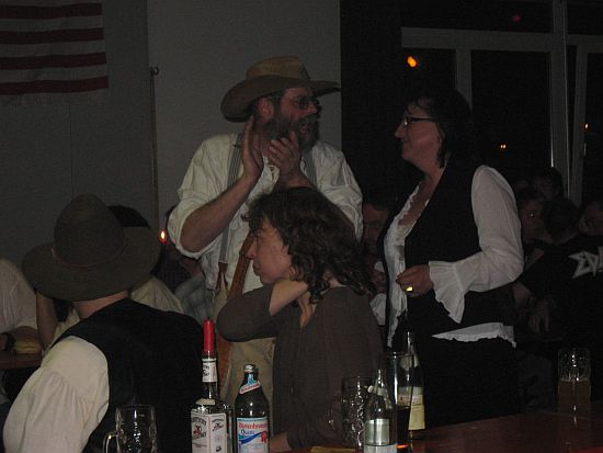 Zwischendurch wird ein echt handgefertigtes Leinenhemd "auf amerikanisch" versteigert. Musiker Rainer übernimmt das Versteigern und wird dabei von einigen "Kentucky Rifles" unterstützt. Das Publikum bietet eifrig mit, und als schließlich der von Andy Ott gestellte Handywecker piept, stellt sich der "Kentucky Rifles"-Vereinskassier als letzter Bieter heraus, und er bekommt dann das tolle Westernhemd. Herzlichen Glückwunsch! (Von dieser Akton haben wir leider kein Bild.)