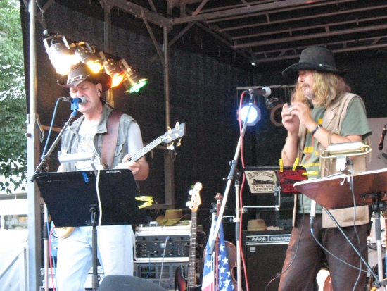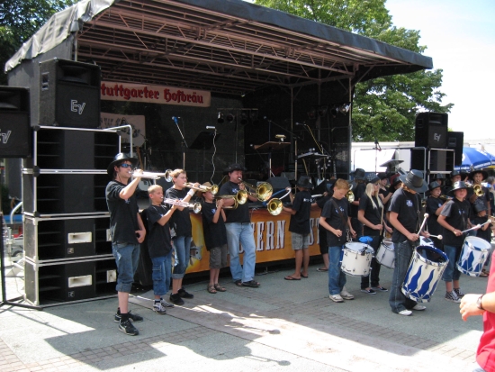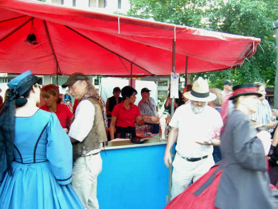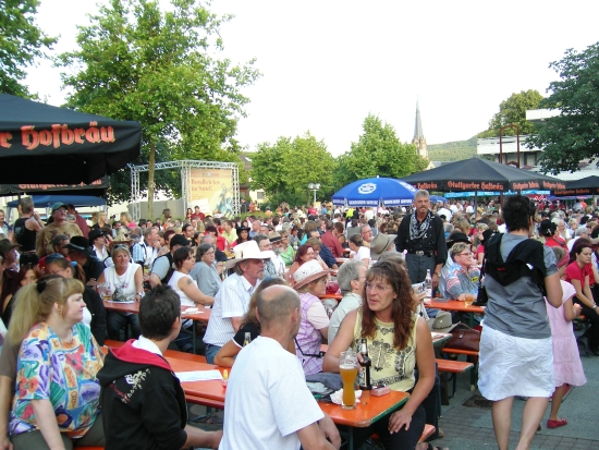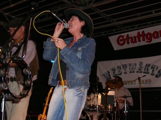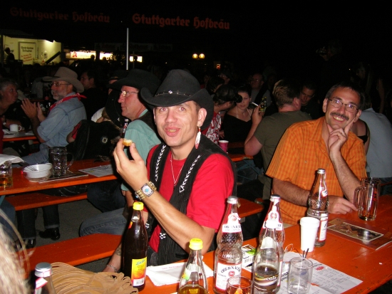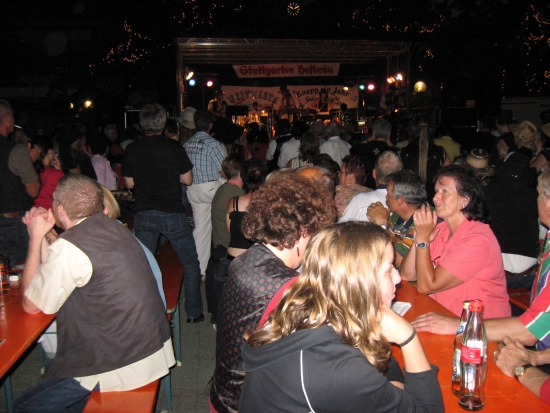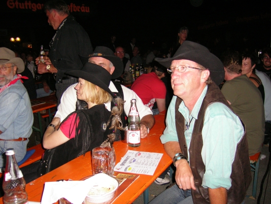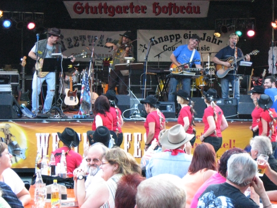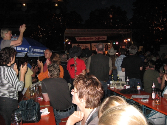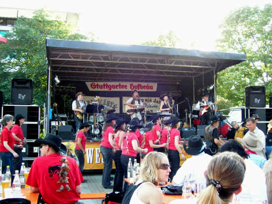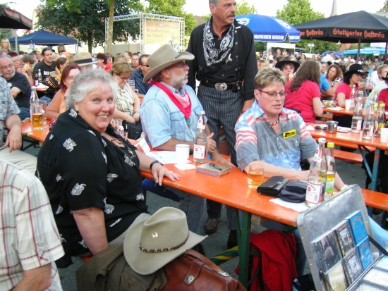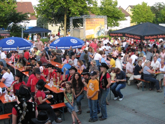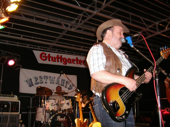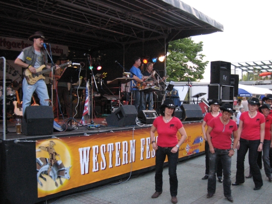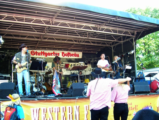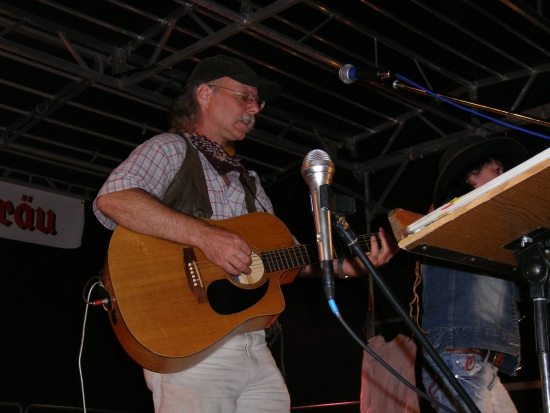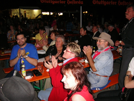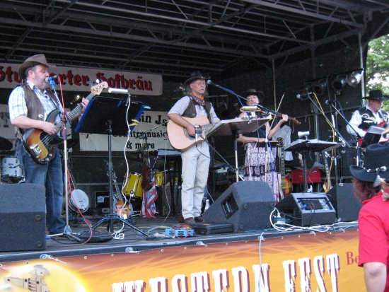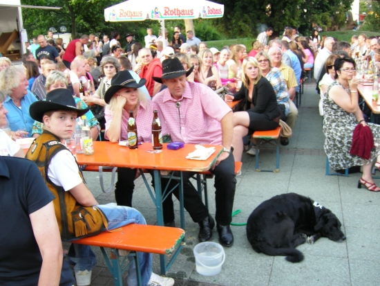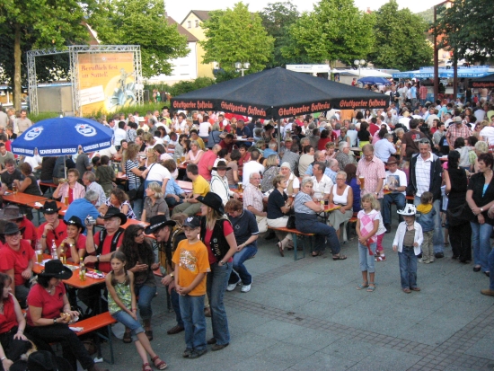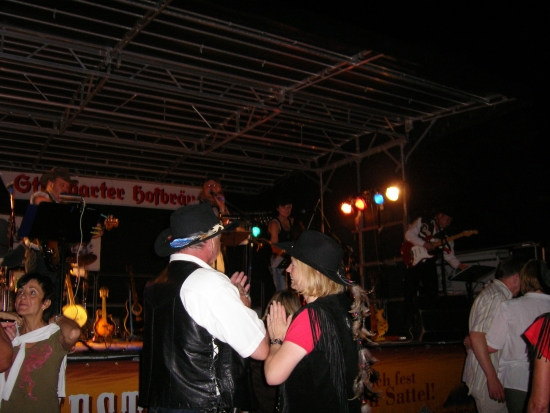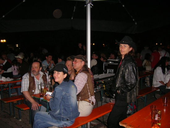 Sa, 04.07.08 Spaichingen/TUT: Westernfest Die Wirtegemeinschaft Spaichingen (bestehend aus den Betreibern von vier Lokalen) rief zum "4. Spaichinger Westernfest", das Wetter spielte prima mit und das Publikum kam in Scharen. Ab drei Uhr war der Festbetrieb geöffnet, es gab Kinderbetreuung, Kutschfahrten, Sattlerhandwerk, Pferde beschlagen, Bull-Riding und jede Menge Futterstände für hungrige und durstige Country-Fans. Bloß hat die niemand von uns fotografiert. Während des Nachmittags strömten schon sehr viele Leute über den Platz, zum gemütlichen Absitzen war es aber zunächst noch zu heiß.