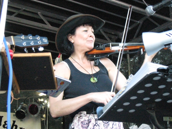 Es geht nochmal richtig rund, und gerade als Rainer das letzte Stück ansagen will, fängt es an zu regnen. Ist aber nur wenig, es ist auch sehr warm, und das letzte Stück und auch ein paar Zugaben können noch gespielt werden. Und in einem warmen Sommerregen lässt es sich noch prima tanzen!